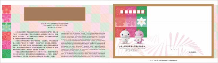 中国集邮有限公司于2025年11月9日发行《粤港澳同心 大湾区逐梦》中华人民共和国第十五届运动会开幕纪念邮折。内插新邮套票、纪念封一枚。