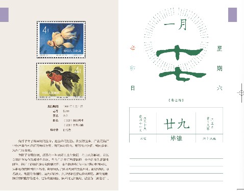 封面采用八卦图与星宿图相结合的形式;收录二十四节气邮票图案 4 套 24 枚;收录传统节日、行业节日和重要纪念日的邮票图案 29 套 53 枚;农历月篇首点缀花神诗、月令诗;节气突出时令风物、花果时蔬,见人间烟火;节日缀有名言哲句,增智培德。