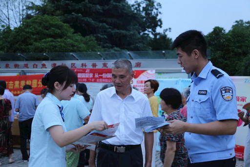 7月8日,由浙江省湖州市吴兴区扫黑办、区公安分局联合市邮政分公司开展的扫黑除恶进村入社暨防诈骗热线宣传活动在龙泉街道白鱼潭社区启动。该活动通过现场宣传和文艺表演的方式向广大社区居民宣讲扫黑除恶知识,解答防诈骗热线的功能和作用。活动中,快板说唱、舞蹈、有奖问答等寓教于乐的节目受到群众的热烈欢迎。