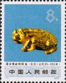 编72,8分,图案为“鎏金镶嵌铜砚盒”,1969年5月在江苏省徐州市东汉墓出土。
