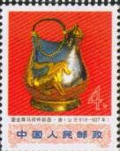 编67,4分,图案为“鎏金舞马衔杯银壶”,1970年10月在陕西省西安市南郊何家村唐代窖藏出土。