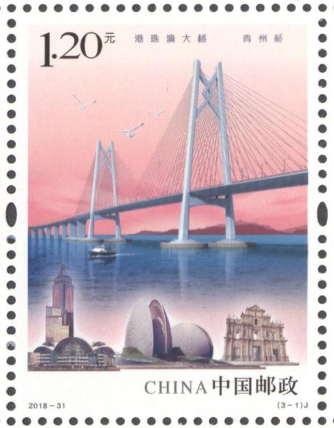 中国邮政2018年10月30日发行《港珠澳大桥》纪念邮票1套3枚。