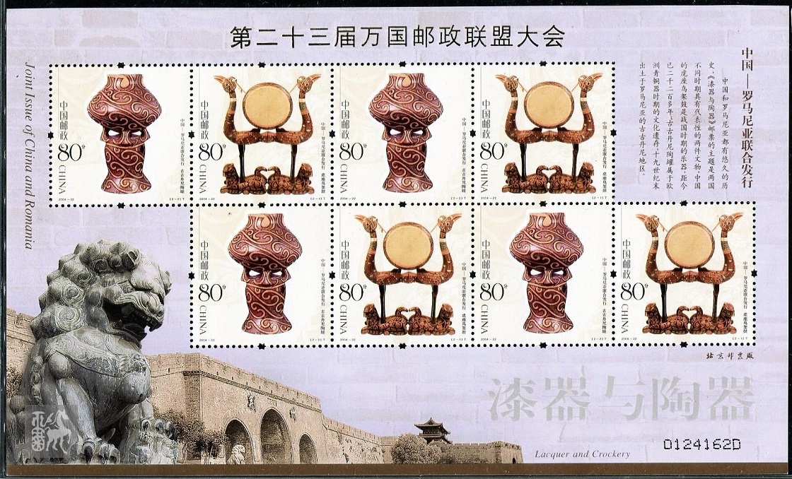 国家邮政局2004年9月22日发行《漆器与陶器》特种邮票1套2枚(与罗马尼亚联合发行)。
