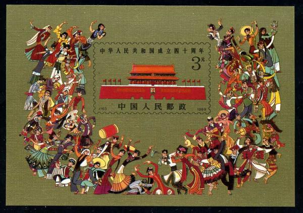 小型张画面中央是天安门城楼,周围环绕载歌载舞的五十六个民族,表现了中国各族人民共同欢庆建国四十周年的场面。