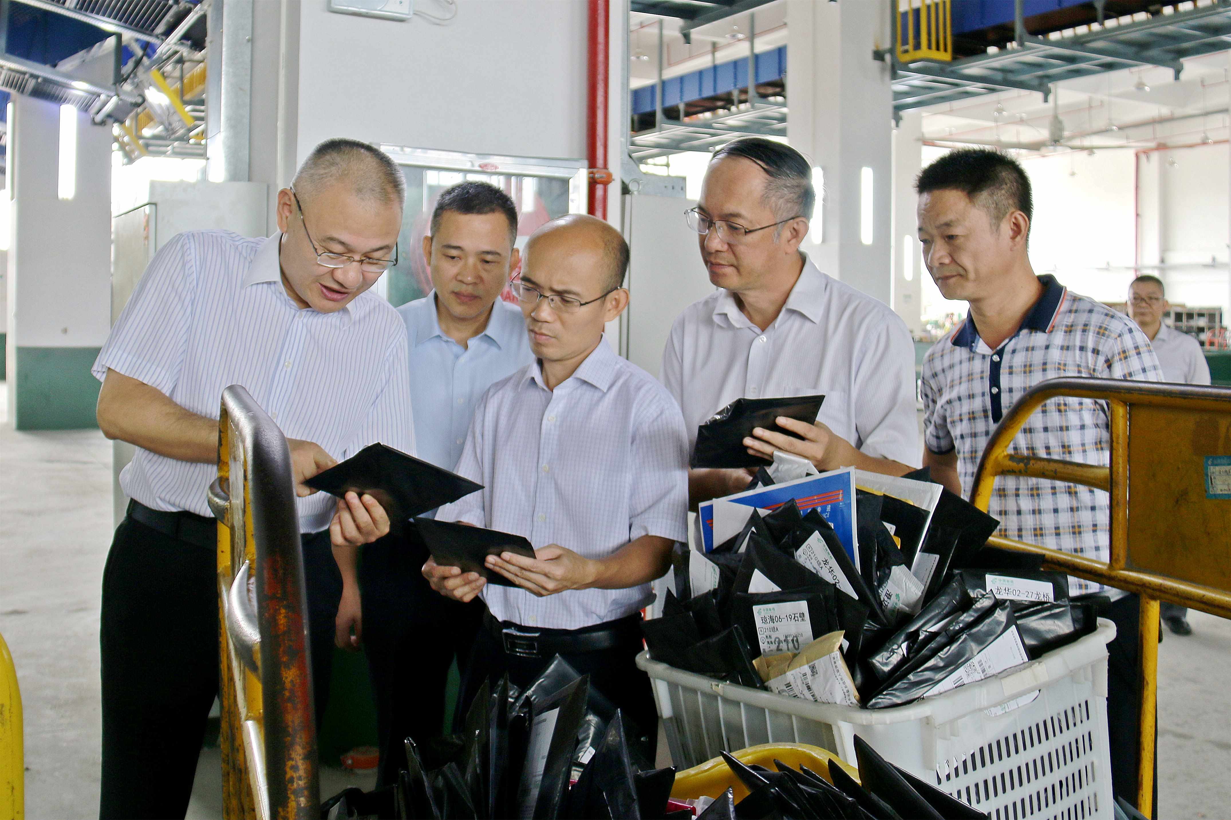 11月12日,省邮政管理局局长丰圣少在省分公司总经理石纯斌、副总经理杜标岭的陪同下,深入新海口邮件处理中心调研,看望和慰问邮政一线员工,实地察看包分机作业流程,了解邮政企业开展绿色行动,迎战“双11”等情况。