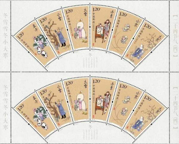 P.S. 二十四节气是我国古代根据一年中太阳在天球黄道圆上位置划分出来的24个具有时节意义的位置与日期,每个节气约15天,是中国人认知天象、物候、时令和大自然变化规律的知识体系与社会实践,是中华民族传统文化的重要组成部分。2016年,二十四节气被列入联合国教科文组织人类非物质文化遗产代表作名录。本套邮票为自2015年开始发行的《二十四节气》系列邮票第四组,表现冬天的六个节气。经过了春天的草长莺飞、桃红柳绿,夏天的阳光灿烂、浓荫匝地,秋天的金风送爽、硕果累累,便迎来了飞雪凝霜、寒风刺骨的冬天。这六个节气分别是:立冬、小雪、大雪、冬至、小寒、大寒。