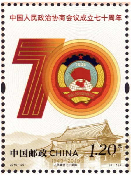 邮票第一图以政协会徽、数字“70”、中南海怀仁堂等元素进行组合设计。“70”代表人民政协成立70年的历史,其中的“0”以政协会徽为中心向外扩展为四个“同心圆”,意为全体社会主义劳动者、社会主义事业的建设者、拥护社会主义的爱国者、拥护祖国统一和致力于中华民族伟大复兴的爱国者组成的最广泛的爱国统一战线,也体现了政协工作将多元化诉求表达纳入理性化、程序化轨道的寓意。画面底图为1949年中国人民政治协商会议第一届全体会议的举办地——中南海怀仁堂。整个设计通过回顾人民政协的历史,不忘初心、牢记使命,讴歌人民政协70年的伟大发展历程。