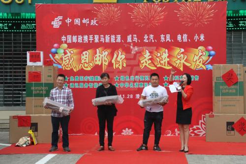 11月28日,中国邮政集团公司澄迈县分公司联袂威马、北汽、东风、电信、小米、中石化和聚马新能源等知名企业在澄迈县永发支局户外广场举办“感恩邮你 走进永发”异业联盟赶集日活动。