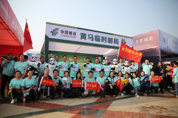 为更好服务和推广2019年黄马赛事,展现黄石依山傍水的城市美景,黄石市分公司精心设计黄马纪念明信片,广大跑友和市民朋友可以在现场设置的黄马临时邮局为纪念明信片加盖纪念邮戳,现场的5名“白兵战士”为大赛加“邮”助威,吸引广大跑友和市民朋友驻足合影留念。