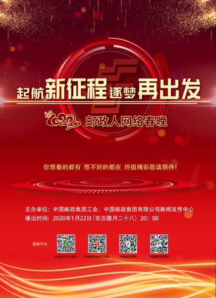 为深入学习贯彻党的十九大精神,落实习近平总书记关于“凝心聚力、成风化人”的宣传指导思想,以及集团公司党组提出的宣扬邮政劳模精神、展示中国邮政发生的翻天覆地的变化和快速发展壮大的硕果,同时让广大邮政职工在繁忙的工作之余过个喜乐年、幸福年,共享邮政改革发展成果,值此2020年春节来临之际,中国邮政集团工会、集团公司新闻宣传中心联合举办2020邮政人网络春晚。经过紧张筹备,晚会直播进入倒计时,将于2020年1月22日(农历腊月二十八)晚上8点(20:00)现场直播。