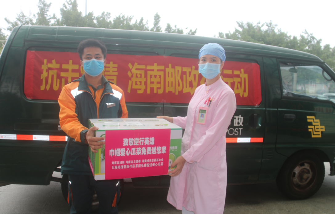 该活动由省妇联联合海南成美慈善基金会发起的“抗击疫情,守护健康”募捐活动的捐款提供资金支持,通过联系优质蔬菜基地为海南援鄂医务人员家庭每周提供一次爱心瓜菜免费配送服务,为他们送上一份关怀和关爱。海南省邮政分公司获悉后,主动对接,为该项目提供全省配送服务。