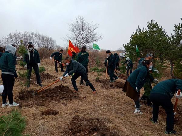 植树现场,红旗招展,大家热情高涨、干劲十足,现场呈现出一片繁忙有序的劳动景象,挥锹填坑的、扶苗踩土的、倒水施灌的,经过一番热火朝天的劳动,一棵棵新栽种的松树亭亭玉立,展现出勃勃生机,分配的300余株树苗在划定的区域“安家落户”。