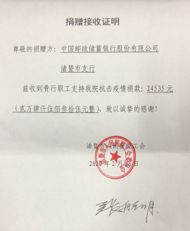 2月26日上午,诸暨市支行党支部委员、副行长、工会主席杨毅,将全行干部员工捐献的24535元赠给诸暨市人民医院,供该院抗击疫情工作使用。