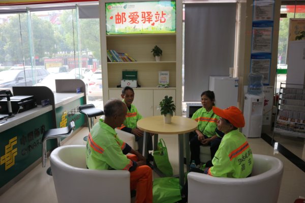 七月初夏,天高云淡,碧空如洗。为积极响应江西省总工会关于推进户外劳动者“爱心驿站”建设的倡议,贯彻落实中国邮政集团公司“人民邮政为人民”的战略部署,7月3日上午,江西省宜春市高安市总工会、高安市邮政分公司在邮政大楼支局网点举办了“邮爱驿站”服务点启动仪式。高安市总工会副主席雷庭,宜春市邮政工会副主席文乐,高安市邮政分公司副总经理、快递协会会长邓义波,高安市邮政分公司副总经理、工会主席杨礼全,高安市环卫处工会主席梁春琴,高安市城管局工会主席兰新华,高安市快递协会秘书长杨 文武,环卫工人、城管人员和快递员代表参加了启动仪式。雷庭和文乐共同为邮爱驿站揭牌。