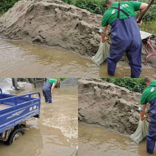 岑河支局在购买不到沙袋的情况下,自己动手、丰衣足食。支局经理龚伟联系到一家沙厂,岑河支局防汛突击队连忙来到沙厂,带上铁揪,将采购的一批蛇皮袋全部装满沙子,这批沙袋顺利运回支局备用。