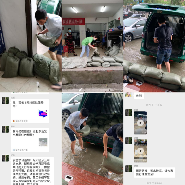 区分公司防讯办在安全工作微信群、QQ群持续播报渍水路况、天气预警、暴雨提示信息,提醒员工时刻关注雨情,提前做好防范;加强对地势低洼营业网点、投递站等场地、房屋滞水情况的排查,及时堆码沙袋。