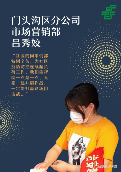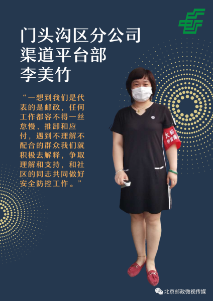 让我们一起看看这群守护社区的邮政人, 他们有什么想说的?“一想到我们是代表的是邮政,任何工作都容不得一丝怠慢、推卸和应付,遇到不理解不配合的群众我们就积极去解释,争取理解和支持,和社区的同志共同做好安全防控工作”(门头沟区邮政分公司渠道平台部李美竹)“社区的同事们都特别辛苦,为社区疫情防控连续超负荷工作,我们能帮助一点是一点,大家一起并肩作战,一定能打赢这场阻击战”(门头沟区邮政分公司市场营销部吕秀姣)“作为一名党员,能在这样的时刻尽自己一份微薄之力,是发自内心的责任和使命,更是一份情怀和荣耀。” (门头沟区邮政分公司服务质量部李树伟)“乡亲们跟亲人是一样的,我作为一个邮政人,不仅要为他们提供邮政服务,在这个特殊时期,更要尽一份力,保障他们的安全。” (门头沟区邮政分公司斋堂邮政支局 劳模王怀敬)