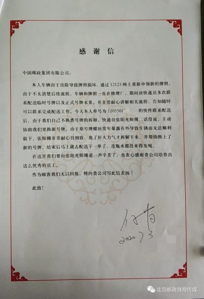 近日,市公司收到了一封感谢信。写信人白先生细致的讲述了通过12123网上重新申领新牌照及更换新牌照过程中,同城业务分公司员工张阳光对他的帮助。信中,他对耐心细致的投递员张阳光表示感谢,并衷心感谢公司培养出这么优秀的员工。