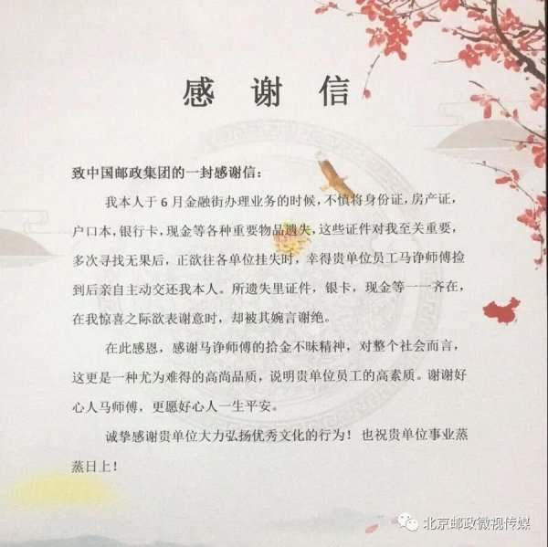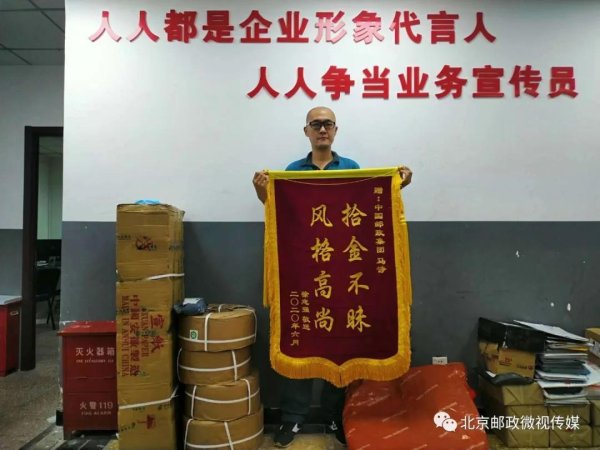 7月16日下午5点左右,用户徐先生来到西城区西单邮政支局金融街营业部,将一面写有“拾金不昧 风格高尚”的锦旗送给快递员马诤,并给营业部经理一封感谢信。