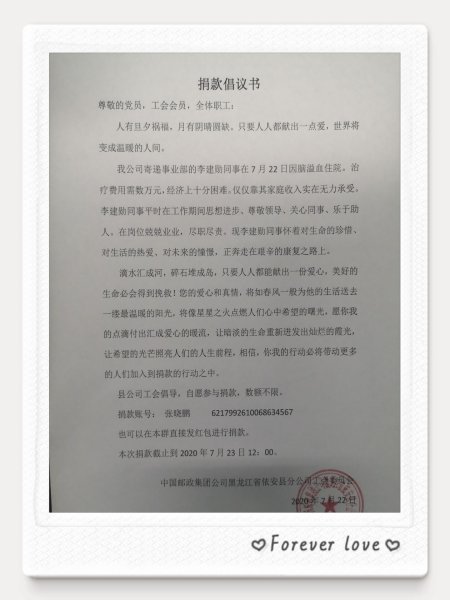 这一噩耗无疑是晴天霹雳,给李建勋的家庭带来了沉痛的打击。病魔无情人有情,依安县邮政工会得知这一消息后,立即向员工发出了“捐款倡议书”,希望大家献一份爱心,尽一份力量,伸出援助之手,用爱心托起生命的希望。