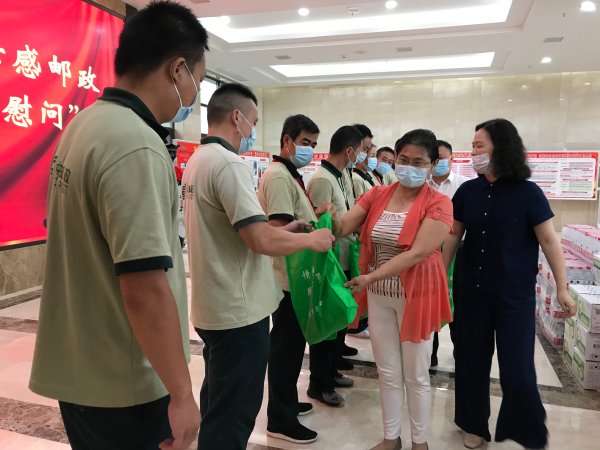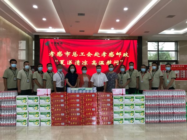 孝感市总工会党组成员、副主席李朝霞一行到孝感市分公司,慰问奋战在一线的邮政快递员、邮运司机,为他们送上了矿泉水、凉茶、金银花露、毛巾、香皂、风油精、人丹等防暑物资。