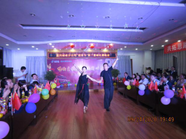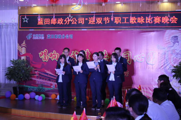 “双节”即将到来,为了喜迎“双节”,西安蓝田县邮政分公司于2020年9月24日举办“唱响主旋律,画好同心圆”职工歌咏比赛晚会,分公司全体职工参加。通过活动的开展,激发职工唱好邮政发展好声音,讲好业务营销好故事,体现弘扬主旋律,传播正能量,传承企业优秀文化,培育职工兴文化、聚人心、树形象的良好面貌。
