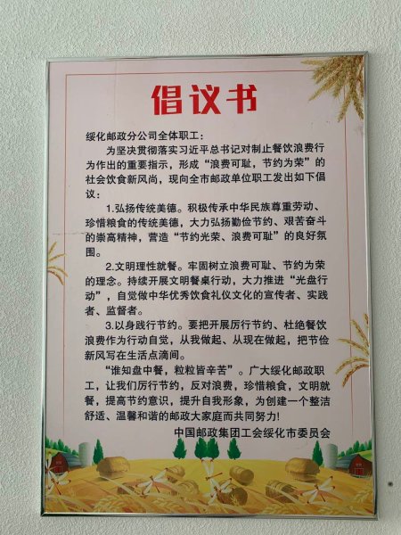 为深入贯彻习近平总书记重要指示精神,落实省邮政工会“我节约 我光荣 我行动”传真要求(黑邮工传〔2020〕13号),坚决制止餐饮浪费的行为,近日,绥化市邮政工会开展了“你光盘,我奖励,共节约”活动。要求广大干部职工反浪费,要节省,发扬中华民族的勤俭节约的美好精神。