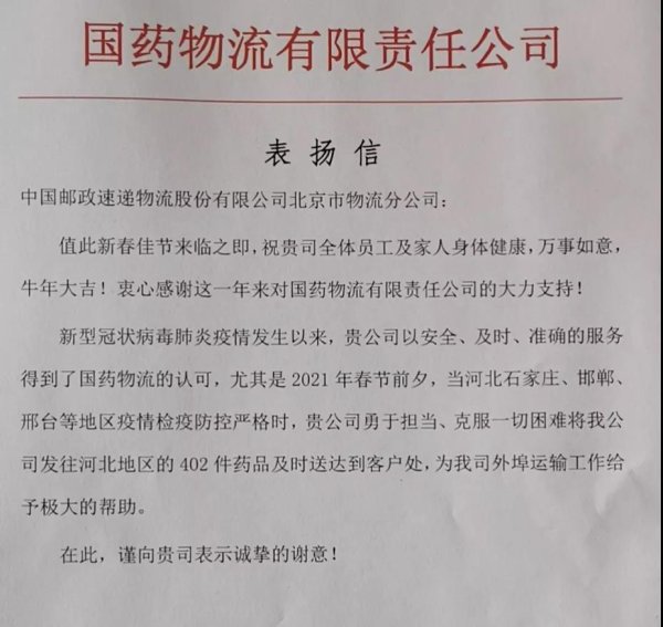 2月9日下午,国药物流有限责任公司经理将一封表扬信送到了物流业务分公司医药项目部张吉林经理手上。原来,就在不久前,正逢2021春节前夕河北石家庄、邯郸邢台等地处于疫情检疫防控严格时期,物流业务分公司医药项目部勇于担当,克服困难,将发往河北地区的402件药品及时送达到客户处,为国药物流外阜运输工作给予极大的帮助。