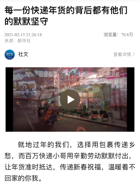 多渠道齐发力。春节期间,北京邮政推出特别策划短片,聚焦“留京过年” 讲述北京邮政投递员留京过年,坚守岗位的动人故事——《每一份快递年货的背后都有他们的默默坚守》。短片生动诠释了北京邮政人响应国家号召在京过年、坚守岗位的故事,赢得广泛关注,取得了良好的宣传效果。短片在新华社客户端、北京日报客户端、 中国邮政报微信平台、腾讯网、凤凰网、 好看视频、芒果TV、网易视频、京邮宣传中心视频号等多渠道、多平台同步播出。截至22日,据不完全统计, 合计浏览量超过80万次。
