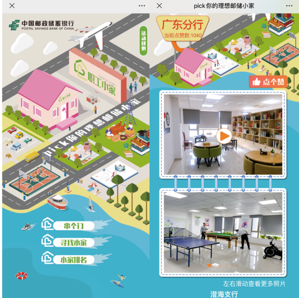 本次“职工小家”示范点线上展示评比活动在“邮储银行微工会”公众号平台上进行,利用H5技术通过视频、照片等方式全方位展示全行不同地域职工小家示范点的精神风貌和文化特色,使职工线上感受我行各具特色的“职工小家”家文化,票选职工心中理想邮储职工小家。