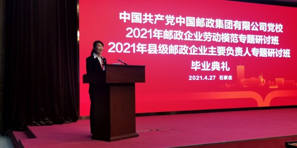 4月27日,在2021年邮政企业劳动模范专题研讨班暨2021年县级邮政企业主要负责人专题研讨班的毕业典礼上,姜雪晶作为研讨班劳动模范代表宣读了《2021年邮政企业劳动模范专题研讨班倡议书》。