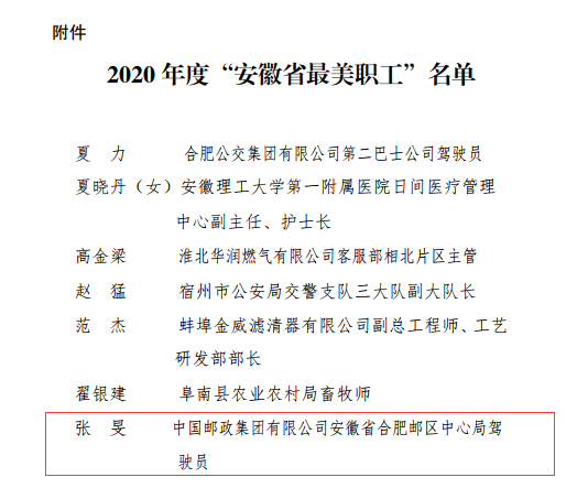 近日,安徽省委宣传部、安徽省总工会联合下文,合肥邮区中心局邮件运输中心张旻同志荣获“2020 年度安徽省“最美职工” 称号。