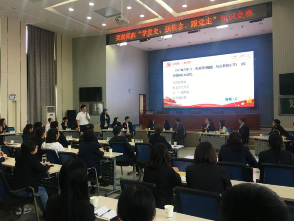 在五四“青年节”到来前夕,4月30日下午,市分公司、工会在八楼开展青年员工“学党史、强信念、跟党走”读书活动暨知识竞赛活动,旨在通过普及党史知识,重温中国共产党的光辉历程,进一步激发全市青年员工爱党爱国的热情,坚定共产主义信念,共同推动芜湖邮政在新发展阶段实现更快更好发展。本次活动还特别邀请了市分公司党委书记、总经理许悦林,党委委员、副总经理汤伟伟出席。 此次活动由全市15个青年理论学习小组成员组成,每小组推选1名参赛选手参加比赛,现场通过抽签的方式,每3名选手组成1支参赛队伍,共组成5支参赛队。活动共分为必答题、抢答题、你来比划我来猜3个环节。经过激烈的角逐,最终评选出一等奖1名,二等奖2名,三等奖2名。