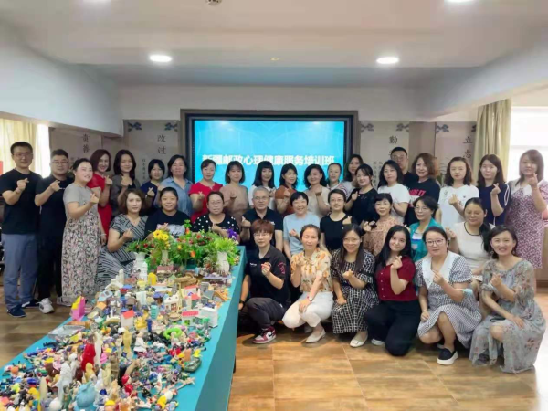 两天的沙盘心理技术辅导中由董云教授带领大家进入了一个全新的沙盘体验课。当我随着教授的指导慢慢地闭上眼睛,缓缓地摸着细沙,遐想漫步在海边的场景,又慢慢的回忆到了以前和儿子在沙漠中玩耍,又回忆到了自己儿时背着书包走到乡间小路上学的场景,感觉沙盘真是一种新奇的体验。随后开启了沙盘的制作,每人用3种玩具完成个人场景,不同的人物、树木、动物、房屋、车辆等呈现在这个有限的沙盘里时,给人无限的意境,沙盘体验从个体情感表达升华到团体,从小我到大局,从个人生活到生态文明,人与自然和谐共存,充分表达出了我们对生活美好的憧憬。