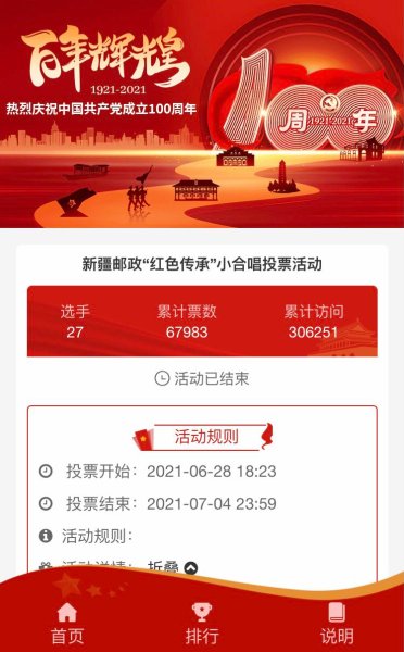 为庆祝中国共产党成立100周年,推动全区邮政学党史、悟思想、办实事、开新局,新疆邮政工会在全区开展了“红色传承”小合唱微视频展播活动,进一步在全区各基层单位营造学习党史,歌颂党情的良好氛围。各单位积极响应,认真准备按要求报送了节目。节目充分展现了中国邮政人坚守初心使命、传承红色基因、高扬党的旗帜、凝聚奋斗精神的时代风采,彰显了邮政职工昂扬向上的精神风貌。区邮政工会从全区各单位报送的37个节目中初步评选出27个节目并采用评为评选(占50%)+网络投票(占50%)的方式进行评选。经过为期一周的网络投票和评为评审最终评选四个奖项,即:一等奖一个,二等奖二个,三等奖三个,优秀节目奖八个。