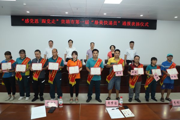 7月14日,由贵港市总工会、贵港市精神文明建设委员会办公室、贵港市邮政管理局、共青团贵港市委员会发起的贵港市第一届“最美快递员”评选活动并进行表彰奖励。贵港市总工会、共青团贵港市委、贵港市邮政管理局、贵港市精神文明建设委员会以及市寄递安全领导小组成员单位有关负责同志出席了表彰活动。