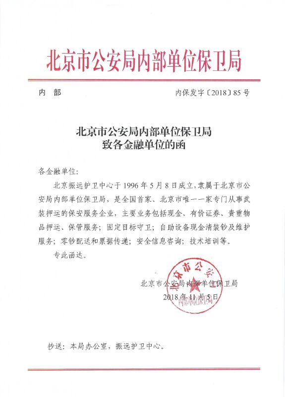 为了确保北京分行网点支行资金安全,一直以来网点现金款箱使用专业的押运服务公司来承担。北京振远护卫中心是北京唯一一家拥有押运资质的公司,安全管理上直接接受北京市公安局领导。目前该中心是唯一一家为北京市金融机构提供款箱守押服务和款箱寄库服务的企业。