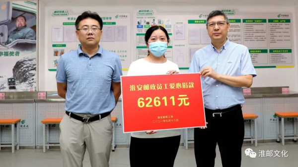 9月18日,当淮安市分公司总经理吕雪松和副总经理张明通将全体员工捐赠的6万多元爱心款交给康城营投部揽投员庄永喜爱人时,她不停地表示感谢。