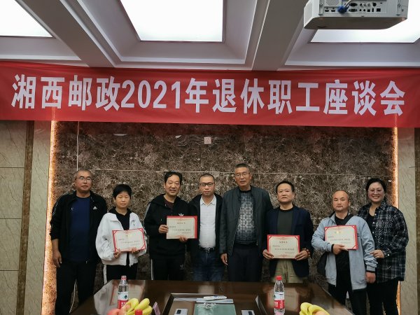 为祝贺老同志光荣退休,感谢他们多年来为邮政事业的辛勤付出,10月13日上午,湘西州分公司本部召开了2021年度退休职工座谈会,州分公司党委委员、副总经理、纪委书记周国富,人力资源部经理邓绍红、工会副主席梁学军和2021年州公司本部新退休职工及相关同志参加座谈会。
