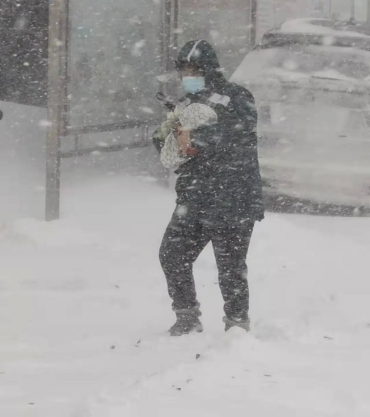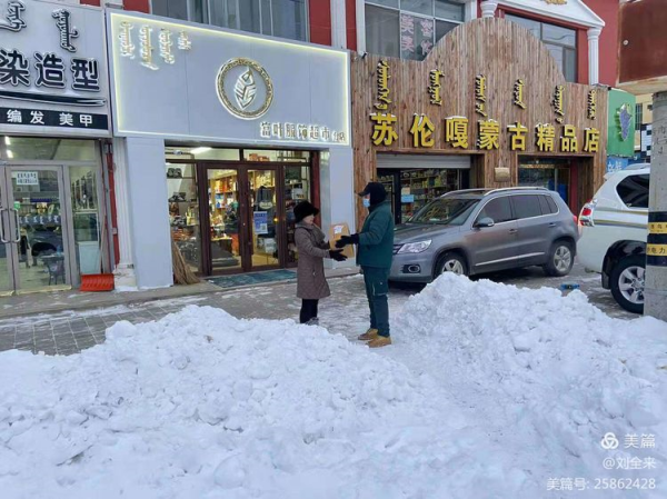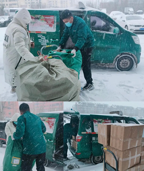 虽然邮路、道段被冰雪覆盖,车辆难以通行。但在这纷飞飘扬的雪花中,有了“娘家人”的温暖,随处可见那抹“邮政绿”。他们坚守岗位,不畏严寒,步履匆匆逆雪而行穿梭于大街小巷、奔波于商家客户的身影,他们满载客户期待,从心出发,尽最大努力将每一封邮件、每一份报纸、每一件包裹及时送到用户手中的画面勾勒出了一幅幅“人民邮政为人民”的感人画卷。