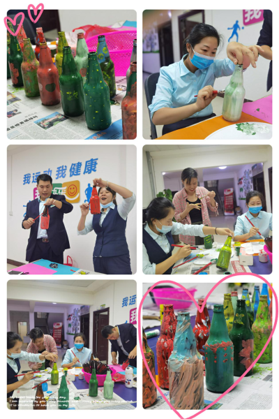 大家利用日常收集的废弃玻璃瓶子,通过手上的画笔一点一点在瓶子绘上不同的色彩,最终绘制成自己想要的模样,绘制完后,看到自己完成的作品的时候,那种开心和笑容是发自内心的成就感。大家笑着说:“生活可以多姿多彩,艺术也可以很简单,原来我也是个被耽误的艺术家”。同时把绘制好的瓶子拿来装饰职工之家,让职工之家更具活力,更有魅力。