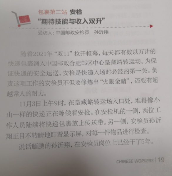 中华全国总工会主管的《中国工人》杂志刊发《一件包裹的“旅程”——购物狂欢背后的劳动万象》文章,访谈我中心邮件快件安检工作。文章提到,安检员一整天都要盯着15寸的屏幕看,分辨几万件快递包裹,干这个活儿需要丰富的经验,更需要责任心。快递安检员是一个专业性非常强的工作。十四大类违禁品和种类繁多的危险品,都需要安检员逐一识别,准确率的背后需要专业知识的积累。
