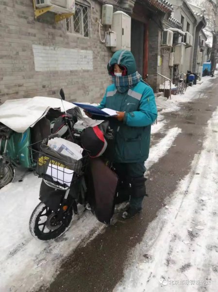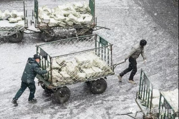 清晨,雪花漫天飞舞,皑皑白雪妆点着银装素裹的北京城。然而, 邮政“小哥”无心欣赏京城雪景。因正值旺季进口高峰期, 周末两天,包裹进口量会有小幅增长, 又逢大雪奇寒天气,投递难度大大增加。面对暴雪、低温、高量带来的困难,各区分公司投递部、营业部启动应急预案,各级领导干部奔赴一线,给大家鼓劲,并叮嘱大家,做好服务的同时要注意出行安全,做好保暖,勿忘防疫。北京邮政“小哥”冒雪依然坚守在邮路上。