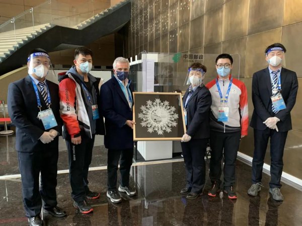 国际奥委会副主席胡安·安东尼奥·小萨马兰奇先生从北辰洲际酒店临时邮局顺利寄出包裹后,对邮政服务十分满意,他亲自来到网点向工作人员致谢,并送上“大美冬奥”主题剪纸艺术品。(北京邮政工会)