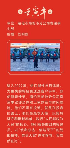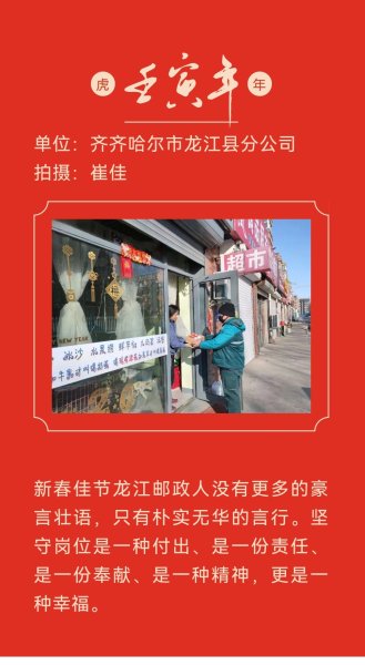 在虎年春节期间,为确保百姓民生,服务地方经济,龙江邮政职工坚守岗位、奋战一线,以实实在在的行动践行“人民邮政为人民”的服务宗旨,用辛勤和汗水诠释劳动精神,用行动和奉献祝福祖国繁荣富强。黑龙江省邮政工会组织全省邮政基层职工开展了“虎年春节我在岗”主题活动,履行职责使命,展现国企担当,塑造邮政形象。