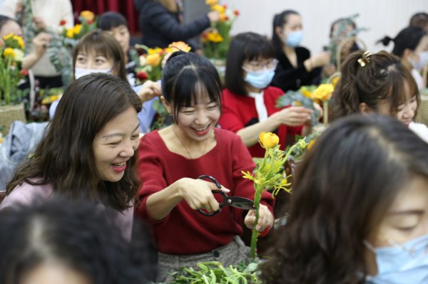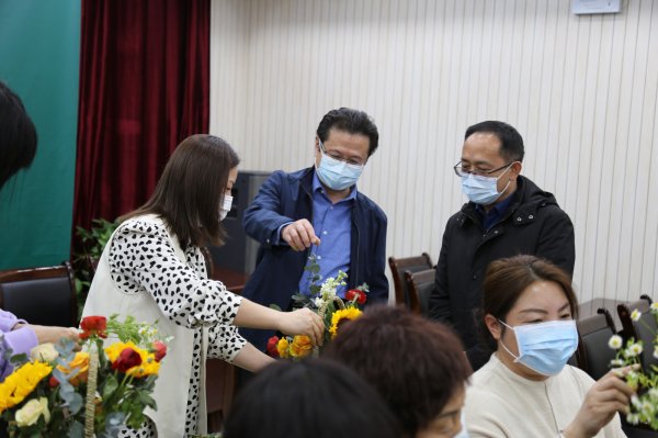 女员工们在李老师的悉心指导下, 用自己灵巧的双手, 尽情发挥创造力,使原本普普通通的花草经自己的巧手修剪后,错落有致地搭配在了一起, 插出了漂亮美丽的花束。