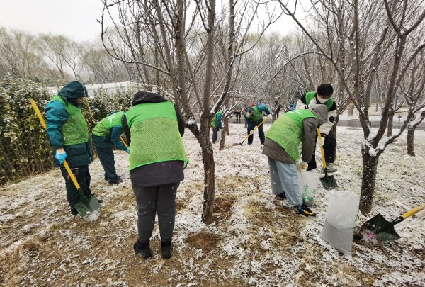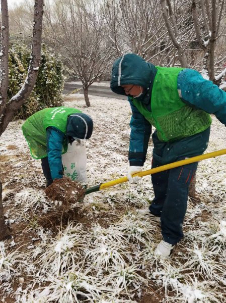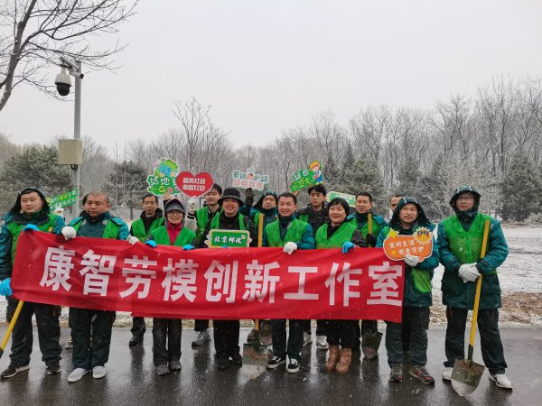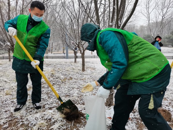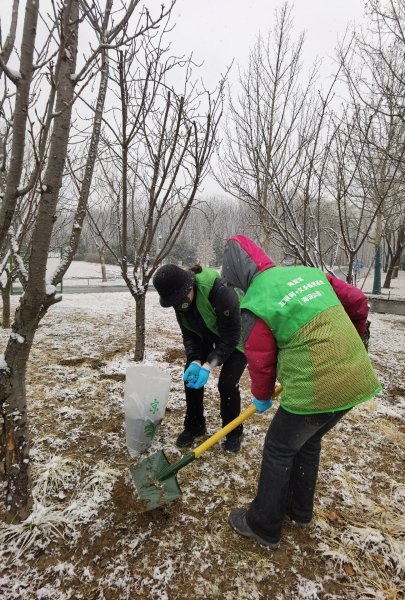 活动开始前,创新工作室领军人、北京市劳模康智宣读了“倡议书”,号召大家自觉履行公民植树义务,争做共建美丽中国的志愿者和实践者。 本次活动的主要内容是对树木进行抚育工作,康智创新工作室成员及工作室招募的在校大学生志愿者共同协作,大家热情洋溢、干劲十足,三人成组、五人成团,有的挥锹铲土,有的为土地施肥,有的回填踩实,大家分工明确、相互协作、衔接有序,充分体现了团结、互助、协作的团队精神,虽然正值雨雪天气,大家不惧风雪,认真完成了近40株树木的抚育工作。