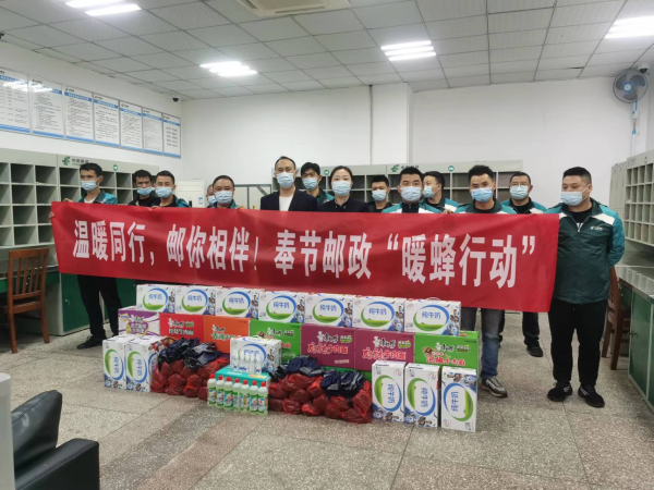 奉节县分公司工会认真贯彻落实市公司“暖蜂行动”,11月11日上午县分公司工会主席管芳到揽投组进行慰问,为大家送去方便面、牛奶、手套、防疫用品等慰问品,并叮嘱员工疫情期间做好自我防护,认真落实旺季安全生产和疫情防疫相关工作,保障“双十一”邮件正常、有序、高效运行,在确保安全的情况下,把邮件送到用户手上,做到邮件不积压、不延误,希望大家齐心协力,打赢“双十一”攻坚战。