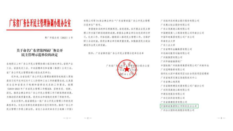 日前,广东省总工会下发《关于命名广东省第四届厂务公开民主管理示范单位的决定》(粤厂开组办发〔2023〕1号),阳江市阳东区分公司被命名为“广东省第四届厂务公开民主管理示范单位”,是广东省邮政唯一获评单位。