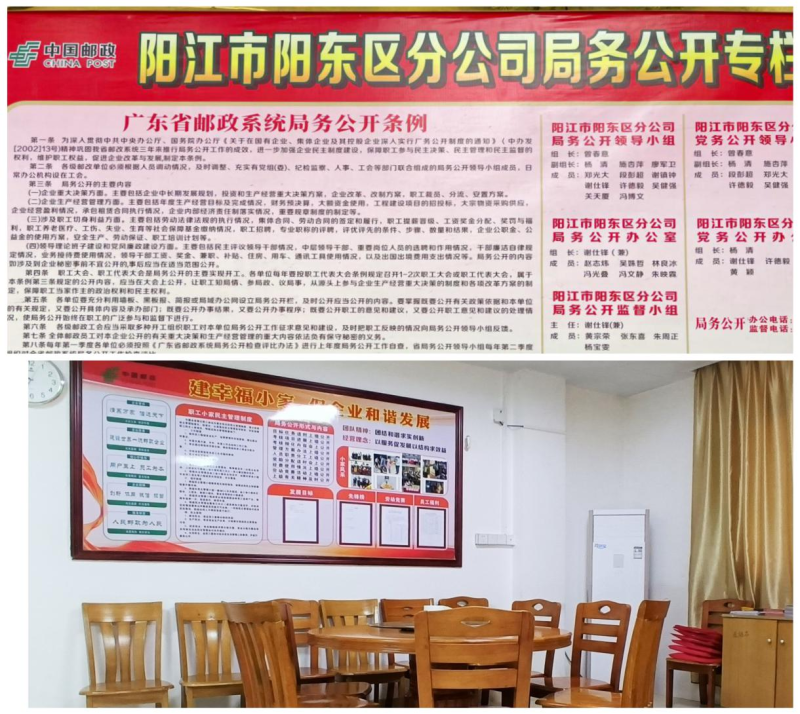 二是紧扣“权利保障”,落实厂务公开管理制度。阳东区分公司制订了《局务公开民主管理标准体系文件》,对公开的原则、内容、形式、程序等方面进行了细化分解,形成了成熟、完整的考核机制,建立健全公开档案。同时将司务公开工作重心下移,触角向基层职工小家延伸,并面向农村支局职工小家制订《民主管理制度》《民主管理实施办法》,促使司务公开工作逐步走上了制度化、规范化、程序化的轨道。在坚持每年召开职工代表大会,实时更新司务公开栏的基础上,落实“四个”公开,企业重大问题决策公开,涉及职工切身利益的问题公开,涉及职工切身利益的问题公开,干部的选拔、任用和管理公开,给职工一本“明白账”,确保了职工的知情权和监督权。